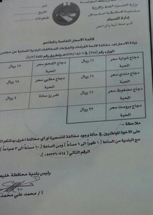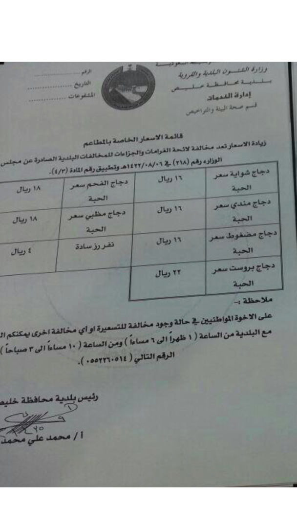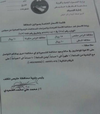 أصدرت بلدية محافظة خليص قائمة بأسعار الخدمات التي تقدمها صوالين الحلاقة وقيمة الذبح والطبخ بالمطابخ