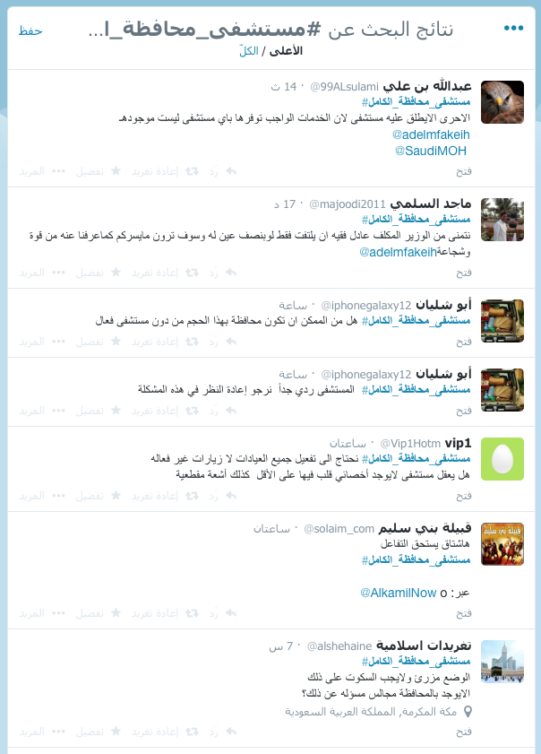 شن مجموعة من المغردين من أبناء محافظة الكامل هجوماً لاذعاً على وزارة الصحة بسبب تردي مستوى الخدمة في مستشفى محافظة الكامل من خلال هاشتاق أطلقوه يوم أمس بهذا الخصوص تحت عنوان #مستشفى ـ محافظةـ الكامل. فقد ذكر أحد المغردين (محمد هزاع السلمي) أنه لا كوادر طبية ولا أدوات متطورة ولا أشعة ولا احترام لساعات العمل وأغلب الأطباء خارج المستشفی أكثر وقت لعدم الرقابة. وكتب (شليان) : المستشفى ردي جداً نرجو إعادة النظر في هذه المشكلة .. هل من الممكن ان تكون محافظة بهذا الحجم من دون مستشفى فعال؟!!