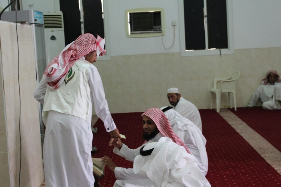 وقد قام الفريق التطوعي بالمنطقة والمكون من( ٢٠ ) طالبا وتحت إشراف لجنة التنمية الاجتماعية الأهلية بالظبية والجمعة ، بتنفيذ هذا البرنامج من توزيع للكتيبات وتطييب المصلين .