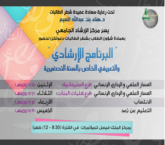 صحيفة غراس الالكترونية > التربية والتعليم > جامعة الملك عبدالعزيز تدعو المستجدات لحضور البرنامج الإرشادي جامعة الملك عبدالعزيز تدعو المستجدات لحضور البرنامج الإرشادي الكاتب: موقع الجامعة 29 أغسطس, 2014م 1 21941 أعلنت عمادة شؤون الطالبات بجامعة الملك عبدالعزيز بجدة عن البرنامج الإرشادي والتعريفي الخاص بالسنة التحضيرية للطالبات والذي سيبدأ يوم الإثنين القادم تحت رعاية سعادة د. هناء بنت عبدالله النعيم عميدة شطر الطالبات. وذلك حسب الجدول الموضح أدناه :