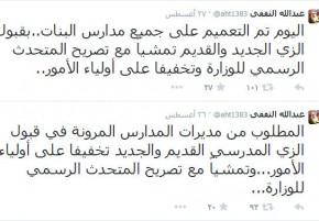 صحيفة غراس الالكترونية > التربية والتعليم > الثقفي لمديرات المدارس : اقبلوا الزي الجديد والقديم معاً الثقفي لمديرات المدارس : اقبلوا الزي الجديد والقديم معاً الكاتب: متابعات 01 سبتمبر, 2014م 0 19704 صدر تعميم مدير عام التربية والتعليم بمحافظة جدة إلى جميع مديرات مدارس البنات بقبول الزي الجديد والقديم تمشياً مع تصريح المتحدث الرسمي للوزارة وتخفيفا على أولياء الأمور. جاء ذلك في تغريدتين للثقفي عبر موقعه في تويتر.
