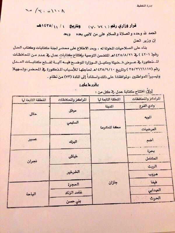 صحيفة غراس الإلكترونية > الأخبار المحلية > قرار وزاري بافتتاح كتابة عدل في محافظة الكامل قرار وزاري بافتتاح كتابة عدل في محافظة الكامل الكاتب: متابعات 01 سبتمبر, 2014م 1 23282 صدر يوم السبت الماضي ١-١١-١٤٣٥هـ قرار وزاري بافتتاح كتابة عدل في محافظة الكامل وعدد من المحافظات بالمملكة العربية السعودية حسبما ورد في القرار التالي :