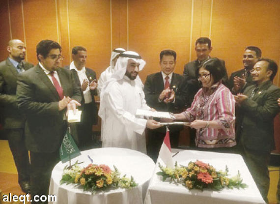 د. أحمد الفهيد ود. رينا عثمان بعد توقيع اتفاقية الشروط في جاكرتا أمس. «الاقتصادية»