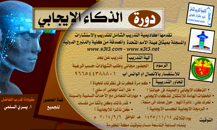 تقدم مجموعة أكاديمية التدريب الشامل للتدريب والاستشاراتدورة في (الذكاء الإيجابي ) بقيادة المدرب القدير أ. يسري السلمي يوم غد (الثلاثاء) 14 / 11 / 1435 هـ الموافق 9 / 9 /2014 م في تمام الساعة التاسعة مساء بتوقيت مكة المكرمة .. تدريب عن بعد على القاعة العامة ( الزرقاء ) الخاصة بأكاديمية التدريب الشامل على الرابط التالي : http://r49dcd255.s.roomsserver.com/