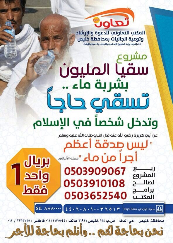 المشروع عبارة عن توزيع عبوات ماء مبردة على الحجاج في مكة وجميع المشاعر المقدسة وتتمثل عبوة الماء 600مل. ويستهدف المكتب في مشروعه هذا مليون حاج على أن يعود ريع هذا المشروع لبرامج وانشطة المكتب