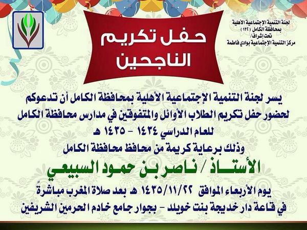 أعلنت لجنة التنمية الإجتماعية الأهلية بمحافظة الكامل عن إقامة حفل تكريم للطلاب الأوائل والمتفوقين من أبناء المحافظة للعام الدراسي 1434-1435 هـ وذلك إيماناً منها بأهمية تكريم وتشجيع أبنائنا الأوائل والمتفوقين برعاية كريمة من محافظ محافظة الكامل الأستاذ/ ناصر بن حمود السبيعي