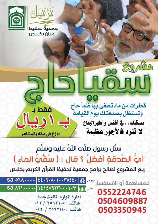 أعلنت جمعية تحفيظ القرآن الكريم بخليص عن مشروع (سقيا الحاج) ودعت المواطنين والمقيمين للمساهمة في المشروع ابتغاء الأجر والثواب من الله تعالي وحددت قيمة السهم بريال واحد وتسعى الجمعية إلى تنفيذ هـذا المشروع خلال موسم حج هذا العام بتوزيع عبوات الماء على الحجاج في مكة المكرمة والمشاعر المقدسة.