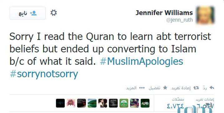 وذكرت الباحثة الأمريكية عبر حسابها على “تويتر”: “أعتذر، قرأت القرآن لأدرس معتقدات الإرهابي؛ لأنتهي بأن أصبحت مسلمة”.