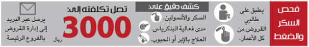 ويتراوح سعر الفحص الطبي السري ما بين 2500 إلى 3 آلاف ريال ويسلم عبر البريد للبنك في إدارة القروض بالفروع الرئيسية كجزء من دراسة الحالة الصحية والمعيشية للمستفيد، ويشترط البنك أن يكشف بشكل دقيق عن السكر ونسبة الأنسولين وهل المستفيد يتعالج عن طريق الإبر أو الحبوب ومدى فعالية البنكرياس.