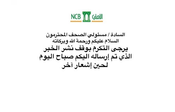 طالبت إدارة البنك الأهلي، جميع الصحف المحلية الورقية والإلكترونية، بوقف نشر البيان الإعلامي الذي وزّعته، صباح اليوم، الذي تضمّن بدء الاكتتاب في البنك الأهلي التجاري، الأحد المقبل.