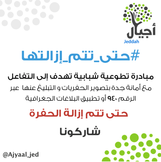 مبادرة تطوعية رائعة قامت بها مجموعة أجيال جدة التطوعية تهدف للتفاعل مع أمانة مدينة جدة بالتبليغ عن الحفر وذلك من خلال التجوال في الشوارع والكشف عن الحفر وتركيب لوحات تحذيرية ثم تقديم بلاغ للأمانة ومتابعته حتى يتم درم الحفرة. كما قاموا بإنشاء هاشتاق علر موقع تويتر لحث الآخرين على التبليغ عن الحفر الموجودة في أحيائهم أو قريبة منهم وتصويرها ونشرها تحت الهاشتاق #حتى_تتم_إزالتها وقد لاقى البرنامج التشجيع والإشادة من كافة أفراد المجتمع.