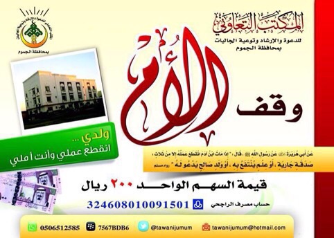 أعلن المكتب التعاوني للدعوة والإرشاء وتوعية الجاليات بمحافظة الجموم عن إنشاء وقف تحت مسمى “وقف الأم” وحدد قيمة السهم بـ٢٠٠ ريال ودعا الراغبين في المساهمة في هذا الوقف الخيري أن يودعوا تبرعاتهم في حساب الوقف التابع للمكتب حسب المعلومات الواردة في الإعلان أدناه.