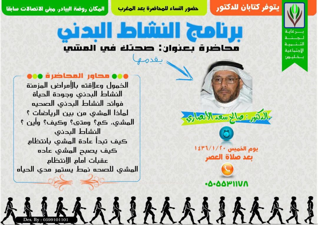 تستضيف لجنة التنمية الاجتماعية بخليص الدكتور صالح الأنصاري أخصائي طب الأسرة والمجتمع وخبير تعزيز الصحه يوم الخميس ١٤٣٦/١/٢٠هـ في برنامج تدريبي ونظري حول النشاط البدني والمشي. يبدأ البرنامجالساعة الرابعة والنصف عصراً بتدريب عملي عبارة عن مشي في الممشي المجاور لشرطه خليص ثم بعد المغرب استراحه ونقاش مفتوح وبعد العشاء ندوه بعنوان صحتك في المشي وتشتمل على المحاور التالية :