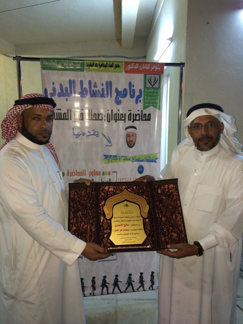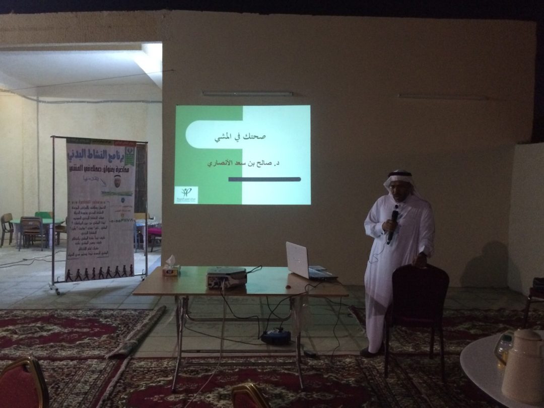 شارك ٥٠ شخصاً في برنامج (صحتك في المشي) الذي نظمته لجنة التنمية الاجتماعية بخليص يوم الخميس الماضي واستصافت فيه الدكتور صالح الأنصاري أخصائي طب الأسرة والمجتمع وخبير تعزيز الصحة واشتمل البرنامج التدريبي الذي بدأ بعد صلاة العصر على تدريب عملي عبارة عن مشي في الممشي المجاور لشرطه خليص ثم بعد المغرب استراحه ونقاش مفتوح وبعد العشاء ندوه بعنوان صحتك في المشي وتشتمل على المحاور التالية :