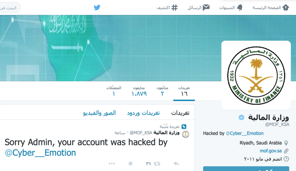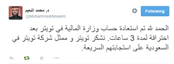 وكان حساب وزارة المالية بموقع “تويتر” قد تعرض للاختراق صباح هذا اليوم على يد الهاكر”Cyber__Emotion” وقام المخترق نشر تغريداته التي ينتقد فيها أداء الوزارة، مطالباً بزيادة مكافآت طلاب الجامعات، ومنتقداً التبرعات للدول المجاورة، ورفض تعيين حراس أمن بالمدارس.
