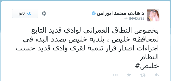 صحيفة غراس الإلكترونية > الأخبار المحلية > بلدية خليص بصدد تحديد النطاق العمراني لوادي قديد بلدية خليص بصدد تحديد النطاق العمراني لوادي قديد الكاتب: متابعات 29 نوفمبر, 2014م 0 10683 أفاد معالي أمين مدينة جدة الدكتور هاني أبورأس بأن بلدية خليص بصدد البدء في إجراءات اصدار قرار تنمية لقرى وادي قديد التابع لمحافظة خليص وتحديد النطاق العمراني حسب النظام. جاء ذلك في تغريده لمعاليه على حسابه الخاص في تويتر.
